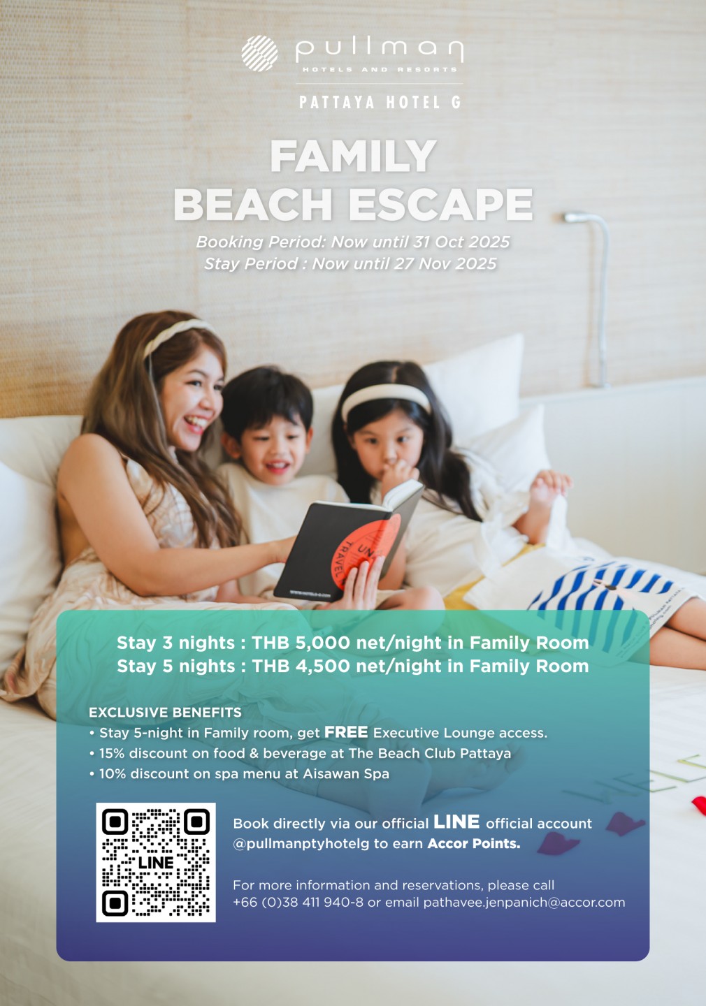 Reconnect, relax, and make unforgettable memories by the sea at Pullman Pattaya Hotel G. From morning splashes in the pool to golden sunsets on Wongamat Beach, your family’s dream holiday awaits in the comfort of our spacious Family Rooms — designed for togetherness, style, and ease.